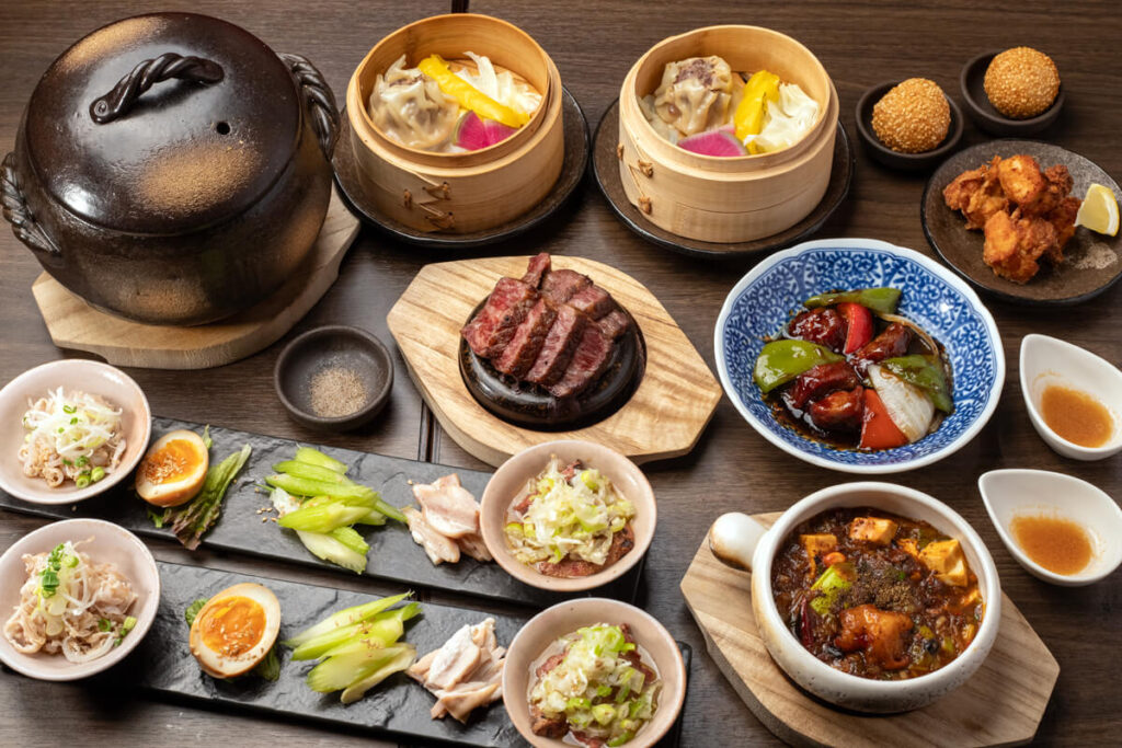 ● 前菜5種盛 ● 点心 ● 揚げ物 ● 逸品 ● ホルモン麻婆豆腐 ● 芝浦直送黒毛和牛 ● 季節の土鍋炊き込みご飯 ● デザート