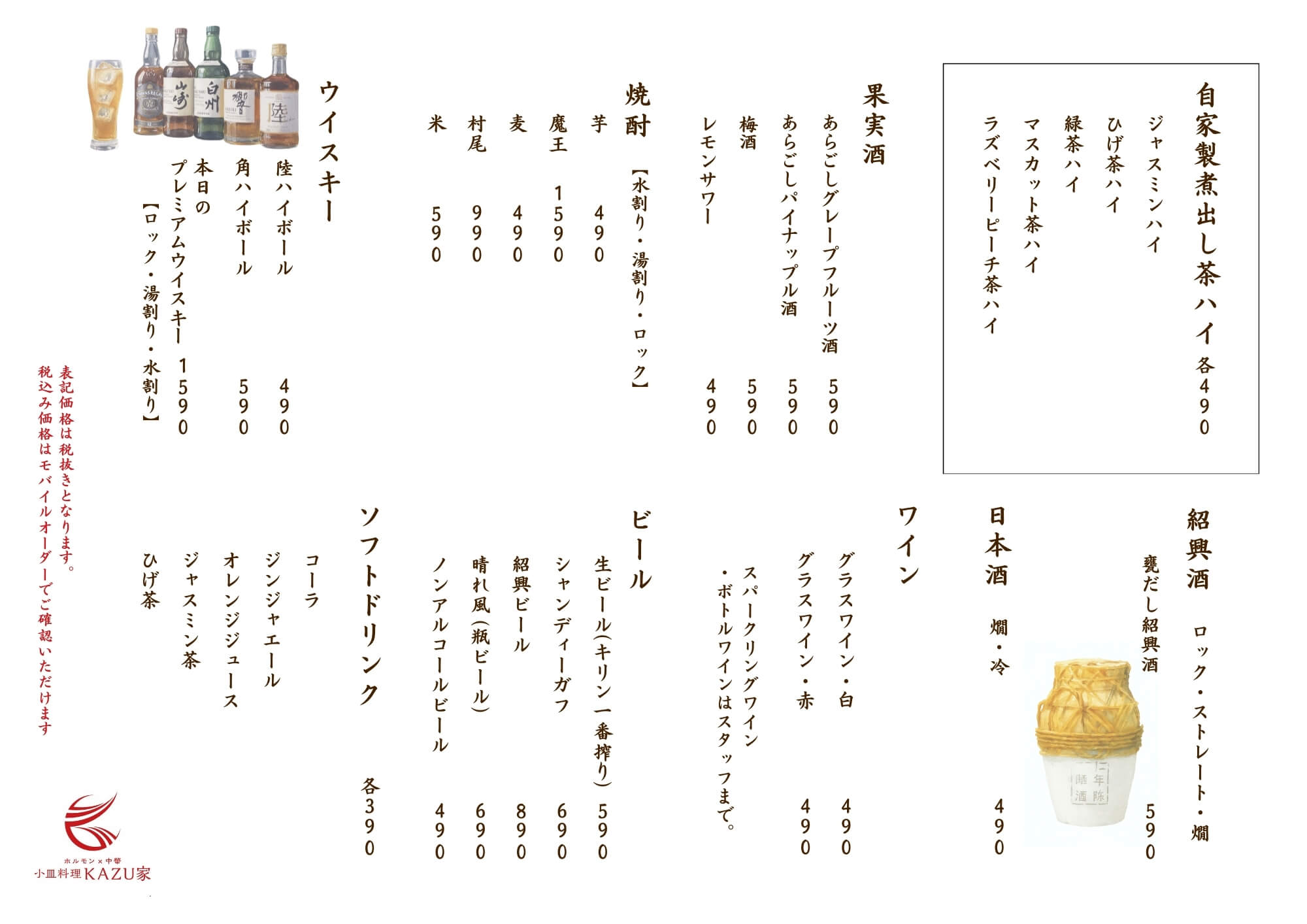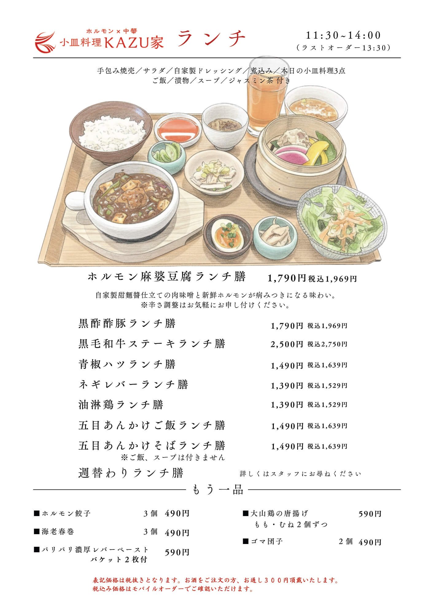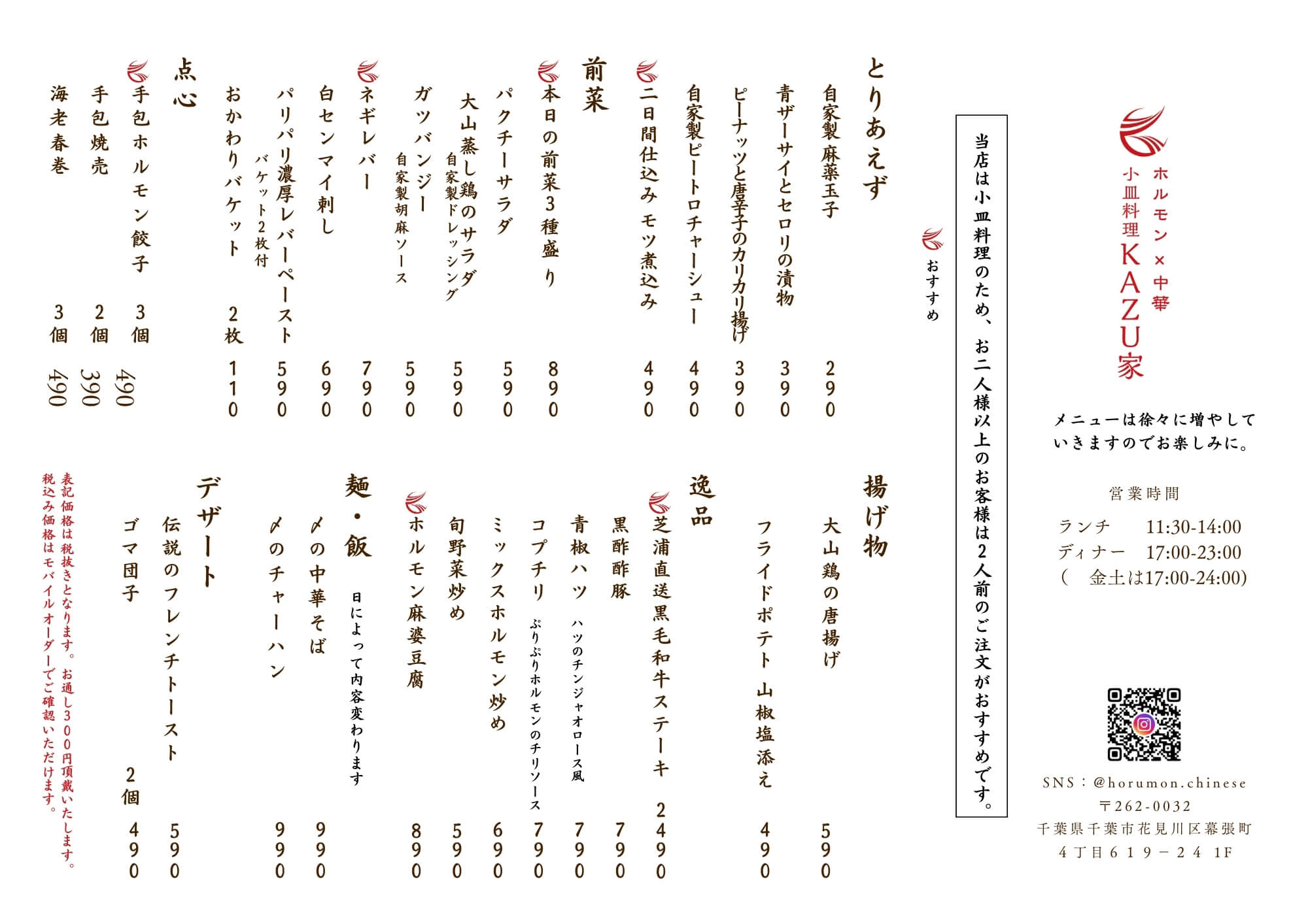 | 店名 | ホルモン×中華 小皿料理 KAZU家 |